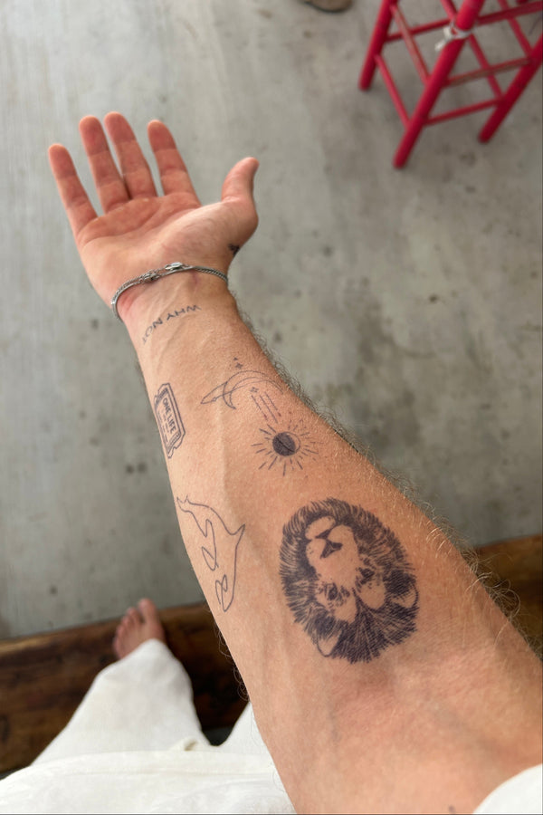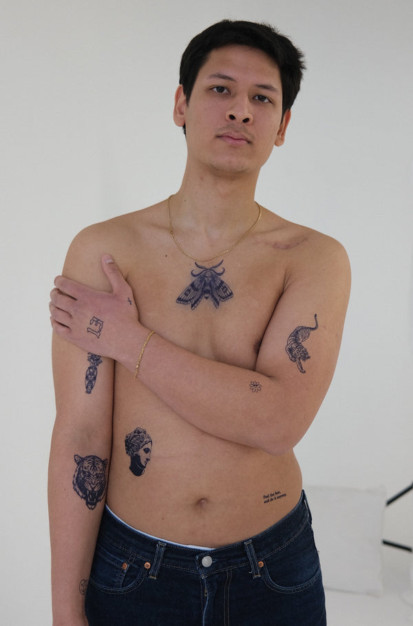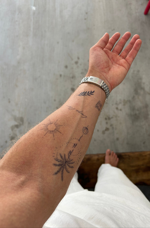 Unsere natürliche Inkster Tinte zieht in die erste Hautschicht ein und reagiert mit natürlichen Verbindungen in der Haut und der Luft, wodurch sie sich schwarz/blau färbt.