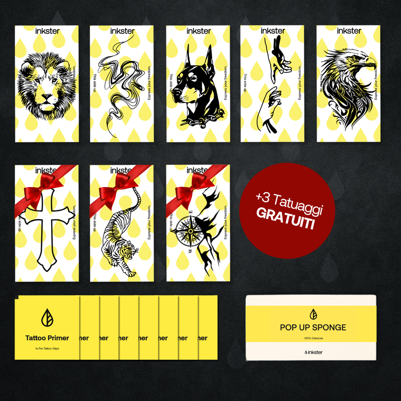Il nostro inchiostro naturale Inkster viene assorbito dal primo strato della pelle e reagisce a contatto con i composti naturali presenti nella pelle e nell'aria, colorandosi di nero/blu.