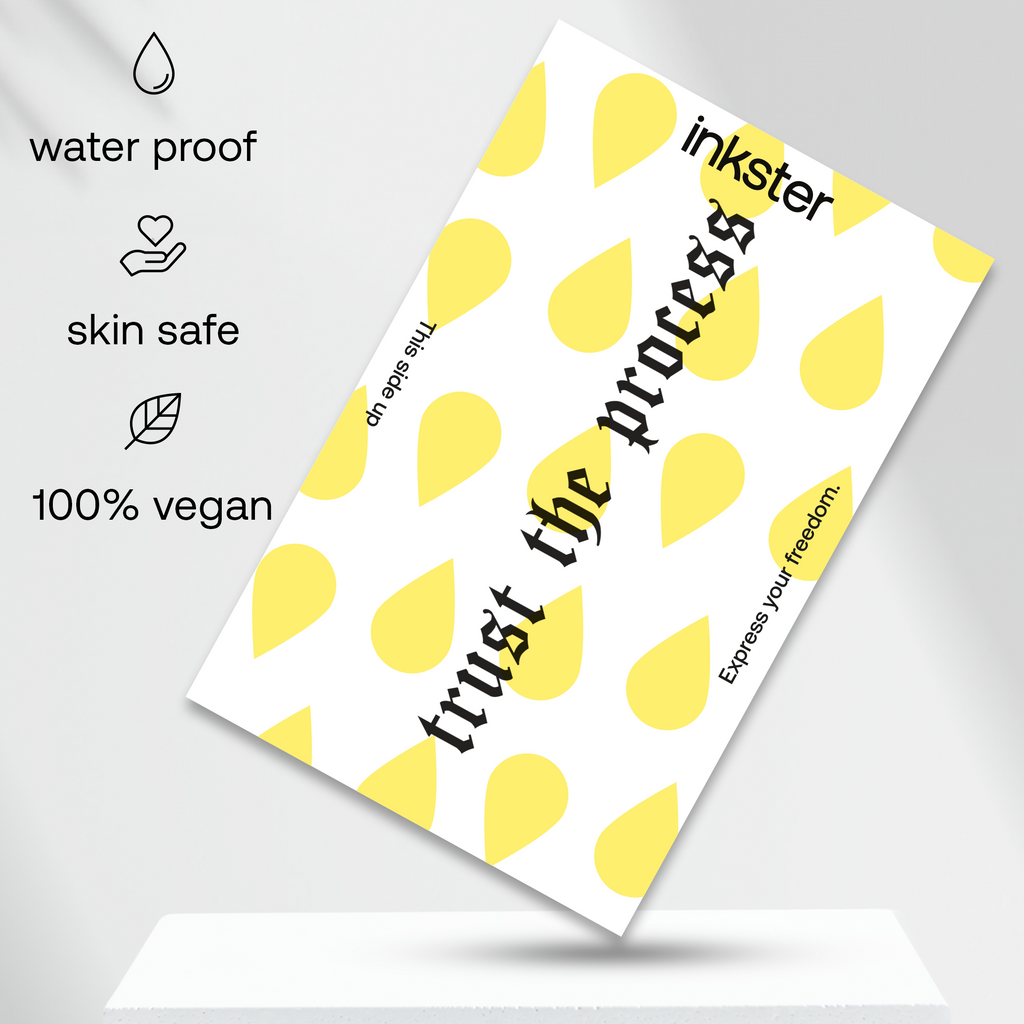 Unsere natürliche Inkster Tinte zieht in die erste Hautschicht ein und reagiert mit natürlichen Verbindungen in der Haut und der Luft, wodurch sie sich schwarz/blau färbt.